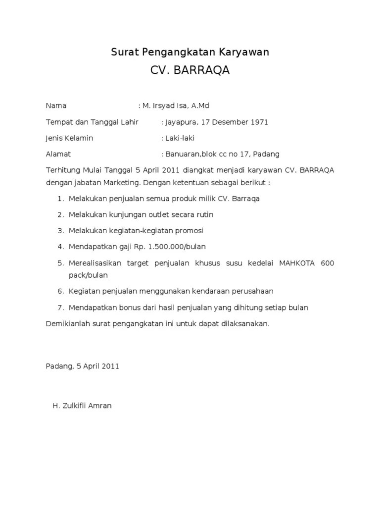 Tamrin badariddin terhitung mulai tanggal 10 januari 2011 dengan jabatan. Walaupun persaingan ketat antara para karyawan untuk memperoleh jabatan karyawan tetap, namun keputusan tetap ada di tangan pihak perusahaan. Contoh surat keputusan pengangkatan karyawan kontrak. Kumpulan contoh surat keputusan pengangkatan karyawan tetap, pengangkatan jabatan, organisasi, yayasan, direksi, kepala sekolah, . Yang telah di syahkan oleh undang undang perusahaan.
